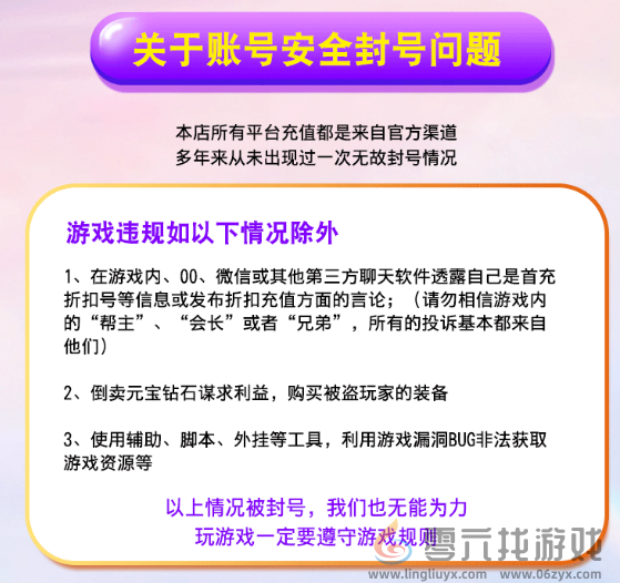 如果因(包括但不限于)游戏厂商或游戏运营平台导致的游戏关服停运、无法续充、充值延迟到账、充值渠道关闭、充值返利及礼包相关问题、苹果设备掉签名等情况:小部分游戏(特别是网易游戏)被游戏厂商扣除游戏币,以及玩家自主行为(包括但不限于游戏内外和其他交互软件上),恶意喊话、利用漏洞获利、非法交易、告知账号给他人被盗等违反游戏规定而被游戏厂商或游戏运营平台处罚的,以上情况本平台仅限于协助玩家联系游戏厂商或游戏运营平台帮忙反馈处理,并不以上述问题采取任何赔偿!